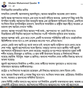 তিনি বলেন, ‘জুলাই আন্দোলনে নির্যাতিত ও শহীদ নেতা-কর্মীদের যথাযথ মূল্যায়নে ও তাদের স্বপ্ন বাস্তবায়নে আমরাও অঙ্গীকারাবদ্ধ। রাষ্ট্রের ও সংবিধানের সংস্কারের প্রয়োজন এই বিষয়েও আমাদের কোন দ্বিমত নেই।